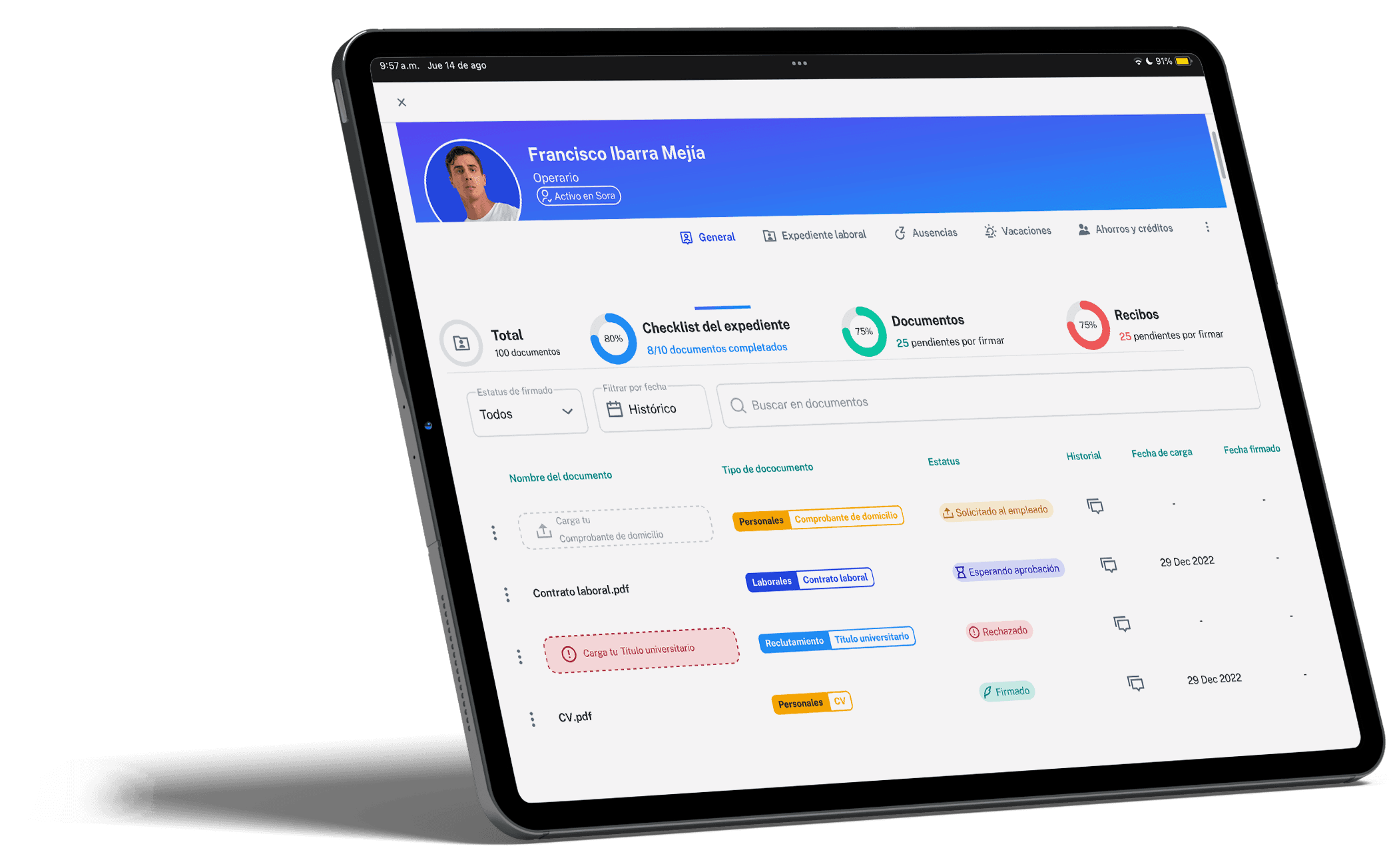 En Sora digitalizamos expedientes y automatizamos el ciclo laboral del colaborador, asegurando que cada documento tenga trazabilidad, integridad y validez legal.